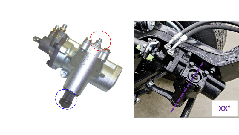 On the steering box, we need to gather the 3 dimensions on the stud sticking out of the top of the box (See red dotted circle in photo below on left) & the 3 dimensions on the splined shaft sticking out of the bottom of the steering box (See blue dotted circle in photo below on left) that the pitman arm attaches to. Ultimately, this is to calculate the steering axis as shown by the purple dotted line in the photo below on the right. To help find the center, there should be divots in each end.