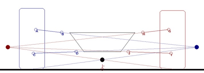 Roll Centers = Cars have two Roll Centers ... one as part of the front suspension & one as part of the rear suspension, that act as pivot points. When the car experiences body roll during cornering ... everything above that pivot point rotates towards the outside of the corner ... and everything below the pivot point rotates the opposite direction, towards the inside of the corner.