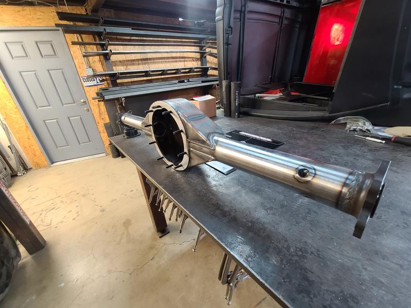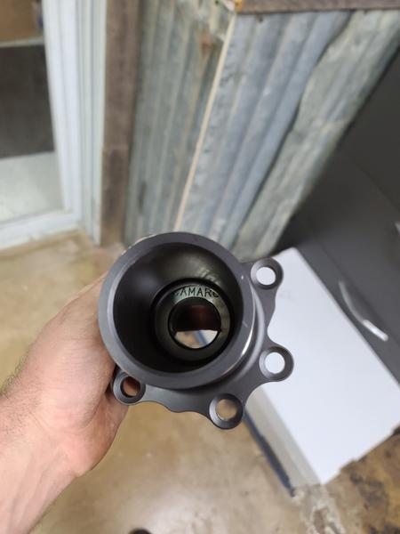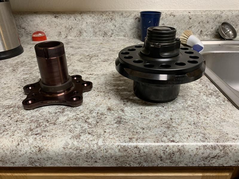 After learning so much through the build it was clear why cars that run solid axles and make a lot of grip run a floating setup. There are a few setups on the market for converting to a full floater but the one that had my eye on, was from Strange Engineering. They have two different versions - one is just a normal floating setup and the other is a camber and toe adjustable setup. They call it their "Pro-touring Floater Kit". It uses a weld on snout for the axle and a bolt on spindle up to -2.5* of camber.  Between the snout and the spindle, there's a spacer plate that can change toe if you desire. Also, the setup uses a hub mounted rotor. Its a Wilwood adapter that can accommodate a parking brake, but I don't want a parking brake so I machined the back of the hat off to try and save some weight.