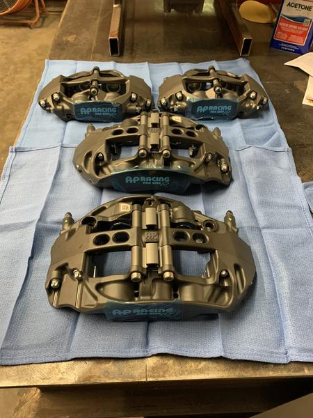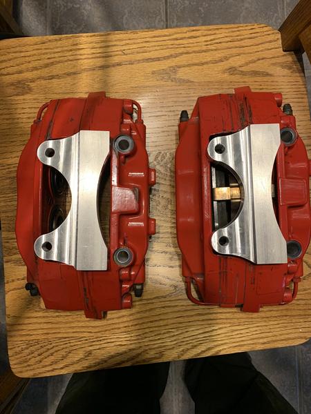 First go around was as budget as I could do them. I found a full set of 3rd Gen Viper 4-piston Brembo calipers, which are just an F40 caliper, radial mounted. I had a friend make me some caliper brackets to go with some brake duct plates I made.