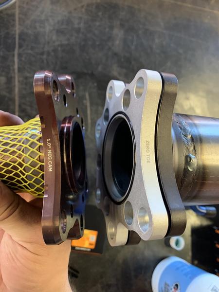 You can see the spindles are labeled -1* and the middle plate that controls toe is set for zero toe. Talking with others who run a similar size tire and IRS are dialing in between -1 and -1.5* of static camber. We'll see what the tire temps say.