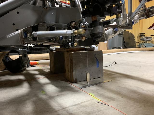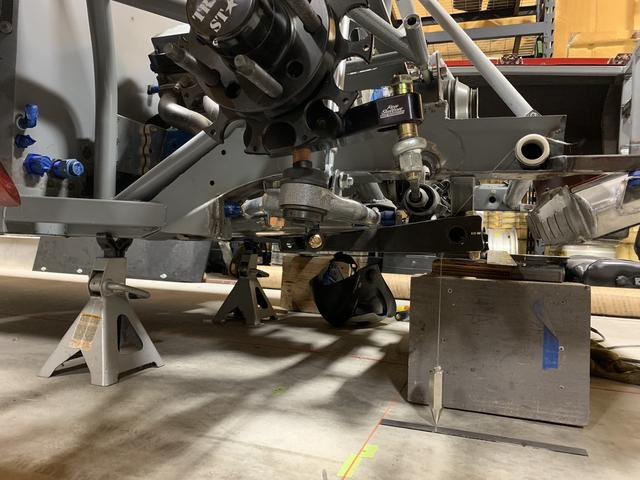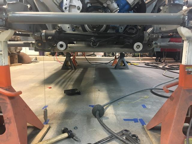 Again with another vehicle CL and leveling the car. Getting old, but also getting pretty quick at it! If the rack looks close to the crankshaft, that's because it is! I had to have a friend of mine put the drive mandrel on a lathe and get it down where it needed to be to clear. I'm just grateful I was able to get it exactly where Ron specified, making bumpsteer easy to set up down the road.