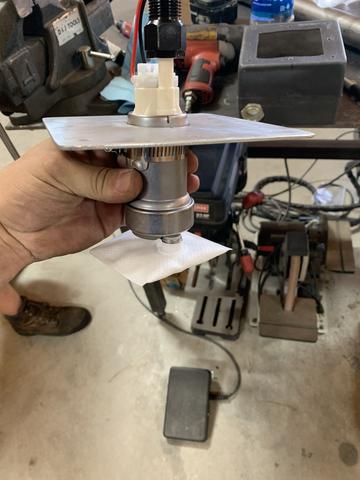 Now it gets fun. A friend gave me one of ATL's surge tanks - ping pong ball style. I think they've moved to a flapper style now, but the principal is the same - a few check valves. I made a hat to clamp the pump and then for reasons I don't remember why, rivetted the hat onto the surge tank. Can't see it, but the return line does plug into the side of the surge tank in efforts to keep it full.