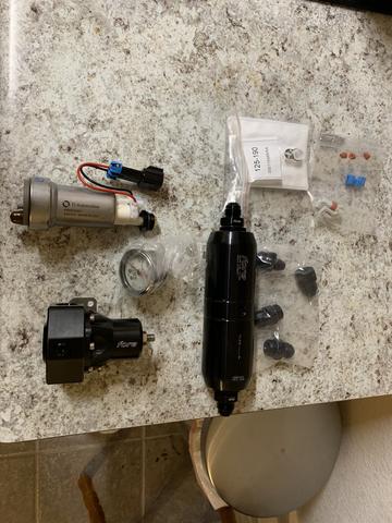 Now onto delivery. There's two rev's of my fuel delivery system and they both worked well so I'll cover them. Here's the basic components that I ordered from Fore Innovations. I remembered Fore from my Terminator days and have always liked their stuff. Plus, support the little guy - Aeromotive makes plenty of money. Basics are a TI Automotive Hellcat fuel pump, Fore's adapter to 8AN, filter, and 3-port regulator. I chose a dead head style system with the reg mounted at the rear and have had zero issues from this style system. Dead head vs a full return is an argument as old as Ford vs Chevy, but the OEM's run this style system even with the big power coming out of Detroit, today. It works just fine - cuts out an entire front to rear run of fuel line, and the regulator mounting becomes way easier and far from heat.